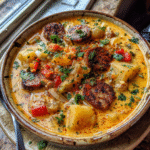 Cajun Potato Soup is a creamy, smoky, hearty soup made with tender potatoes, the Cajun holy trinity (onion, celery, bell pepper), and browned andouille (or kielbasa) in a spoon-coating broth. This easy one-pot recipe uses Cajun seasoning, garlic, and a splash of half-and-half for bold flavor that’s perfect for cold nights and meal prep. Top with cheddar and green onions for a loaded bowl.