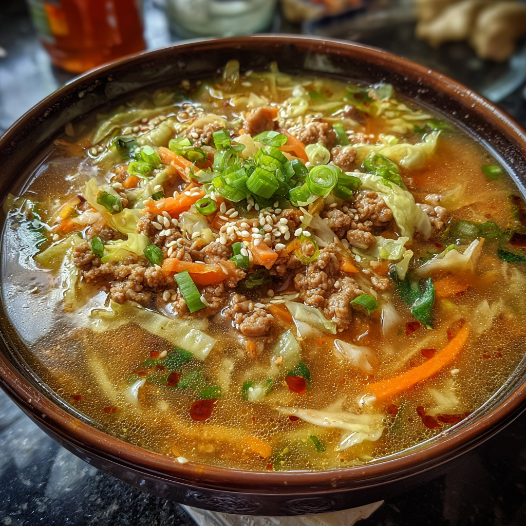 Cozy One-Pot Egg Roll Soup is a warm, takeout-inspired bowl with savory ground pork (or turkey), tender cabbage, sweet carrots, and a gingery garlic broth finished with sesame oil and rice vinegar. It has all the flavor of an egg roll without frying, and it’s perfect for quick weeknight dinners and meal prep. Top with green onions, toasted sesame, crunchy wonton strips, and chili crisp for that classic egg-roll crunch.