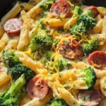 “Comfort in a skillet: smoky sausage, cheesy sauce, and broccoli all in one pan — quick, satisfying, and impossible not to love.”