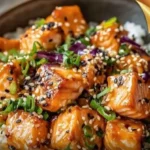 4. Whisk the sauce and assemble bowls quickly so the rice absorbs flavor but the salmon skin stays crisp.