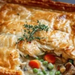 This classic chicken pot pie combines tender chicken, hearty vegetables, and a creamy sauce encased in a flaky, golden pastry, perfect for cozy dining.