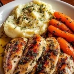 A comforting family dinner of juicy garlic-herb chicken served over cheesy mashed potatoes with sweet, honey-glazed carrots.