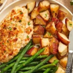 A simple yet delicious one-pan dinner featuring tender, seasoned chicken with a crispy Parmesan crust, roasted potatoes, and vibrant green beans.
