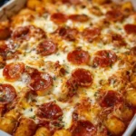 A layered, bake-and-forget casserole that combines crispy tater tots, pizza sauce, gooey cheese, and pepperoni for a nostalgic pizza experience in every bite.