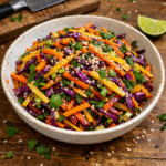 Bright, crunchy, and bursting with fresh flavor, this Rainbow Carrot Sesame Salad is the kind of dish that instantly wakes up your taste buds. Colorful shredded carrots, crisp vegetables, and fragrant herbs are tossed in a savory sesame dressing that delivers the perfect balance of nutty, tangy, and slightly sweet flavors.